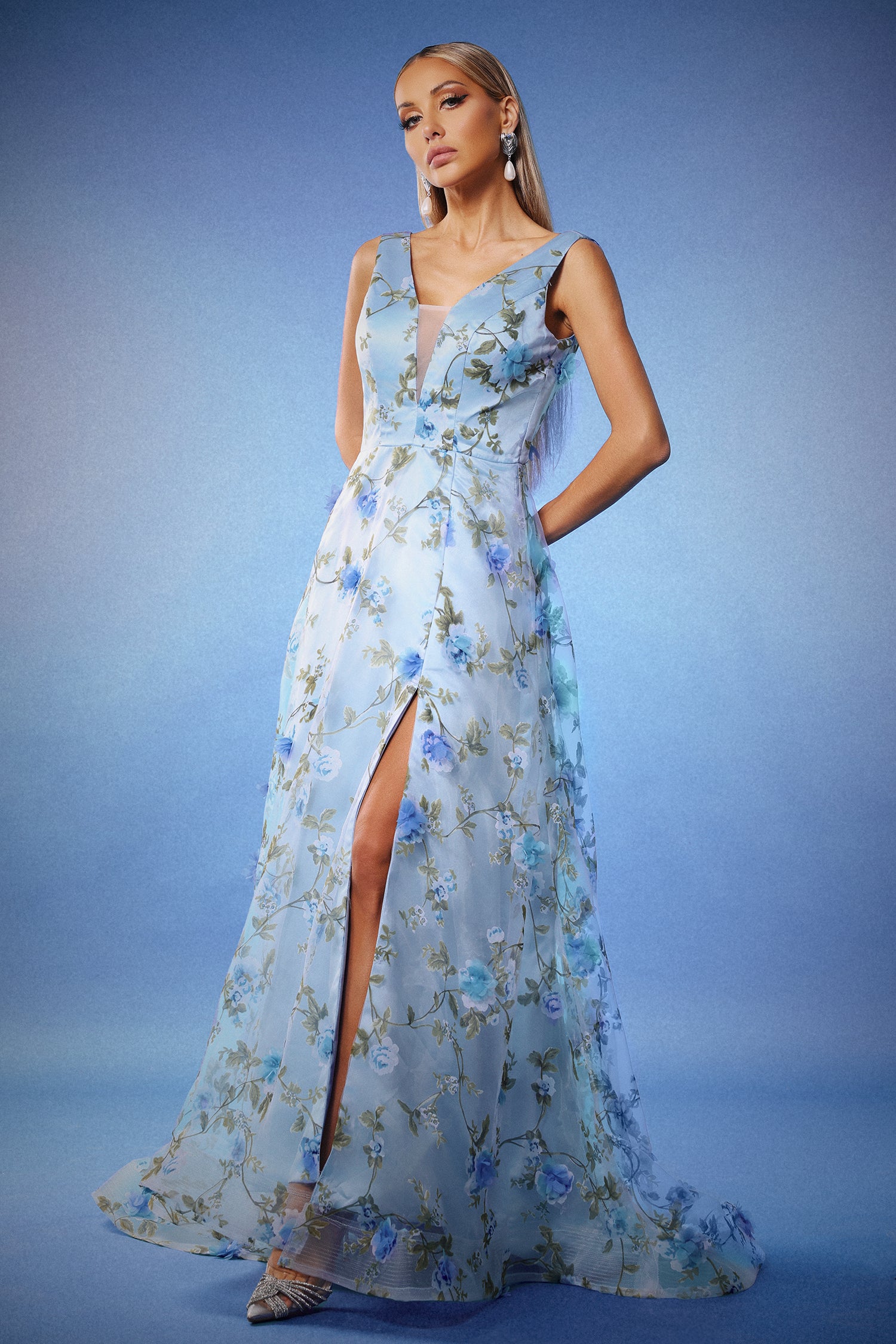 Zurri Kolsuz V Yaka Çiçek Desenli Yırtmaçlı Maksi Elbise